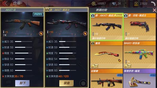如图, AK47-B 和紫色品质的 AK47- 樱花相比,前者仅在主弹夹数上弱于后者,其他数据完全一致,即:论输出伤害、精度,两者相同;论续航时间,后者占优。 AK47-B VS 源 AK47- 黑武士