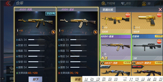 AN94 系列的武器在 CFM 武器库中并不算特别常见,主要还是以 M4 系列以及 AK 系列为主,但是 AN94 属性丝毫不逊色于上述的两个系列武器,使用得当的话会有非常亮眼的表现。上图所示的就是 AN94- 凤凰的属性面板了,威力属性介于 M4 系列武器以及 AK 系列武器中间,仅仅略逊色于 AK ,但是这把武器的精准度以及射速属性非常不错,虽然稳定度低一些,但是上手难度还是要比 AK 系列武器小一点。 【 AN94- 凤凰的属性对比情况】