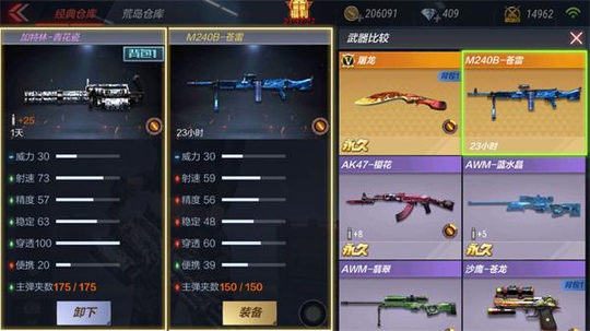 如图,加特林 - 青花瓷和加特林 - 熔岩相比,前者在穿透数据上领先后者,便携数据上弱于后者,其他指数保持一致,即:两者无大的差距,仅在适用范围上有所不同(前者穿透强、后者移速快)。 加特林 - 青花瓷 VS M240B- 苍雷