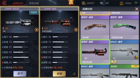 根据上述信息,我们可以看出:加特林 - 青花瓷的硬伤在于换弹和切枪速度,此期间易被敌方目标输出和带走。不过,其出色的精准度和稳定性却足以弥补其缺陷,为小伙伴带来幸运。 【枪械对比】 加特林 - 青花瓷 VS 加特林 - 熔岩