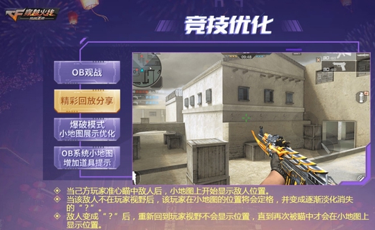 想玩家之所想!地图场景全面优化 CF手游“翼飞冲天”新春版本,还针对玩家们提出的意见和建议进行了相应的优化。其中,包括鹰眼(高清、贺岁、夏日)以及矿场等多张地图在实战中存在的不足之处;目前,相关的设定和场景已完成优化,相信能让广大玩家体验到更痛快的竞技环境。 鹰眼地图中潜伏者酒吧入口侧现已扩宽,潜伏者可以靠左边进入酒吧,避免先天劣势;对于利用率极低的“酒吧内部”场景现已调整结构,让潜伏者能更容易利用酒吧内部的掩体;在酒吧走廊出口几处掩体箱子现已被“搬走”,此举相信能让对枪更适合步枪持有者。至于地图中部分掩体或结构看似可以穿透却不能穿透的情况,包括B包点附近的二楼栏杆、酒吧走廊掩体等,现已调整为可穿透。