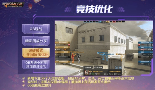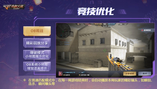 日前,《穿越火线》手游(简称:CF手游)正式发布“翼飞冲天”新春版本。该版本在推出“电竞传奇”AI竞技场等众多新玩法之余,还针对广大玩家关注的“战后回放”、“OB观察者视角”、“地图场景”等设定进行了全面升级与优化,整体涉及改动细节多达数十项,充满彰显游戏始终坚持“玩家至上”的运营理念。 “战后回放”全面升级,轻松分享精彩击杀时刻,彰显个人强劲实力;“OB观察者视角”升级,增设暂停选项,选手动态一手掌控;地图场景优化,鹰眼(高清、贺岁、夏日)地图结构调整,全面改善竞技环境。此外,针对玩家们提出的“卫星基地-高清、潜艇-高清等多张地图存在高空空气墙”一事,现已全面修复完毕,感谢广大玩家长期对游戏的支持与厚爱。