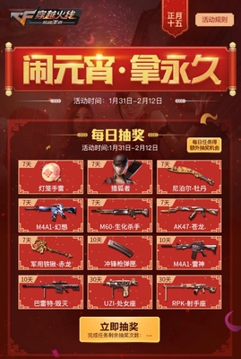 不仅如此,CF手游限时福利“重返巨人城全金卡”也将于今日(2月10日)结束。想要获取金卡的玩家,赶紧呼朋唤友去挑战“重返巨人城”吧! 10 款枪械等你来抽!“闹元宵·拿永久”活动来袭 CF手游“闹元宵·拿永久”福利活动筹备10款枪械、1款道具和1款角色供玩家们抽取,100%中奖!截止至2月12日,玩家登录活动页面、完成排位赛1局、团竞胜利1局、排位杀敌等任务即可获得抽奖机会,RPK-射手座、UZI-处女座、巴雷特-毁灭、M4A1-雷神等枪械唾手可得。