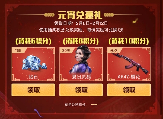 此外,玩家每日抽奖可获得1个“元宵兑豪礼”兑换积分;累计6/8/10分即可分别兑换钻石、夏日令狐、AK47-樱花(永久)等福利!上线就能抽奖,累计抽奖还能直接兑额外福利,广大玩家怎能错过?