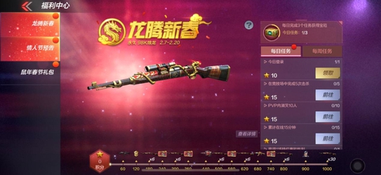 永久98K-烛龙唾手可得!“龙腾新春”福利上线 想获得“98K-烛龙(永久)”等福利?CF手游“龙腾新春”活动就是最佳选择!截止至2月20日,玩家通过完成“登录活动页面”、“在线15分钟”、“排位赛胜利”等任务即可获得活动积分;通过累计这些积分,玩家就能获得各种武器、角色和道具等福利。