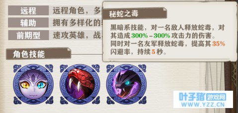 技能2: 秘蛇之毒:黑暗系技能,对一名敌人释放蛇毒,对其造成300%-300%攻击力的伤害。同时对一名友军释放蛇毒,提高其35%闪避率,持续5秒。