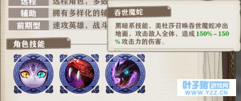 技能3: 吞世魔蛇:黑暗系技能,美杜莎召唤吞世魔蛇冲出地面,攻击敌人全体,造成150%-150%攻击力的伤害。