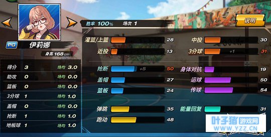 绝杀传球,球场上的最佳队友! 世界级的游戏冠军伊莉娜,对篮球有着自己独特的理解与无人能比的球场洞察力!她总是能掌控进攻节奏,将篮球精准送到空位队友手中。她的爆发技能——绝杀传球,能100%为队友制造空位出手的机会,关键时刻轻轻松松绝杀对手!