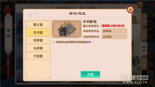 帮派建筑达到相应的升级条件后可以进行升级。 帮派建筑等级越高,提供的附加效果也更强大。 升级帮派建筑需要消耗帮派资金 编辑:叶子猪小秘书