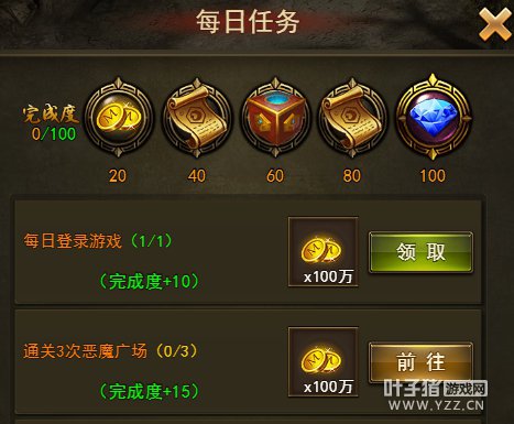 2、每日任务 每日可接取一轮任务,完成指定目标,可获得奖励。点击主界面的日常图标进入。