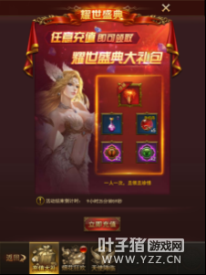 活动时间:2017年11月28日0点-2017年11月28日23点59分 活动内容: 活动一、耀世盛典大礼包 活动期间,充值任意金额即可领取丰厚的奖励,活动期间每人仅可领取1次。 (奖励内容根据活动开始时服务器的世界等级获取) Ø 世界等级大于380级: 耀世庆典爆竹*1,2倍经验药水*1,直升1级丹(限时)*5,月白宝石*4,进化宝石*1