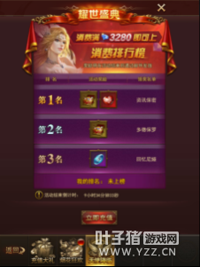 活动三、天使降临 活动期间,消费钻石达到3280钻石以上并且在本服消费前三的玩家100%获得以下道具: 第一名:大天使宝箱*1,大天使之心*1 第二名:大天使宝箱*1 第三名:神鹰火种*1