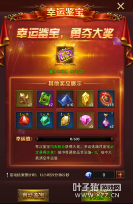 活动内容: 活动首次鉴宝免费,每次鉴宝花费50钻石,每次鉴宝 均有机会 获得大奖。 幸运值满时鉴宝 必定获得大奖 !若抽中普通奖品,则幸运值+10,抽中大奖后将清空幸运值。 活动奖励: Ø 世界等级1~400