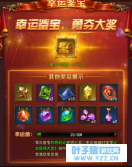 鉴宝大奖: 转职卡/不朽先魂选择礼包*1 普通奖品:2倍经验药水*2、5级反伤之石*1、5级暴击之石*1、5级治疗之石*1、强化套装石(防具)*15、圣装石*2、玛雅宝石*3、进化宝石*2、魂尘*10、宝石精粹*2 温馨提示:如上述内容与游戏内有出入,请以游戏内实际获得为准。 编辑:叶子猪小秘书