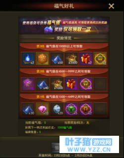 活动时间: 拼图收集时间: 2月13日5点 至 2月23日5点 福气领好礼时间: 2月23日 5点 至 2月25日24点 活动内容: 春节拼图活动开启期间,玩家可以通过击杀跨服或中立BOSS、完成日常任务或者活动内购买,获得道具“藏宝图”。 1.使用藏宝图可以触发各种事件,完成事件即可获得拼图碎片。集齐指定数量的拼图碎片,即可点亮对应拼图,获得点亮奖励。 2.当所有拼图集齐时,即可领取章节大礼。 3.在春节拼图活动中可获得道具“新春福袋”,使用福袋可以获得福气值,累积的福气值可以在福气好礼开放领奖时,领取对应档次的奖励。福气值越高,奖励越丰富。