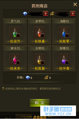 ps:小天使温馨提示,因为副本的小怪具有不同的控制技能,小天使推荐勇士们在开始战斗前购买免疫这些控制技能的药剂哦~~ 药剂商店 1、勇士们可以勾选购买相应的药剂,来免疫不同的控制技能哦~