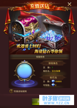 二、 前往指定新服,充值送钻 区服范围: 荣耀回归服 开启条件: 连续 30 日未登陆游戏 即可触发指定新服的回归活动。 活动时间:3月31日5:00 后 活动说明:活动开启后,连续30日未登录游戏方可触发活动,且活动刷新时间为 每日凌晨5点 。例:玩家在3月31日5点后回归,若要参与充值有礼活动,必须在3月1日 5点后 未登录过游戏方可触发。此活动只在荣耀回归服( 荣耀启航服 )开启。 (注:天数按活动刷新时间5点计算,即每日凌晨5点到次日凌晨5点算1天) 活动内容: 超过30天未登陆游戏,在荣耀回归服注册角色并进行绑定后可参与活动,每次充值都将额外获得 充值金额*10 的额外钻石数量。直至钻石池总额为零。(钻石池上限受账号历史充值总额影响,此活动只在荣耀回归服开启)