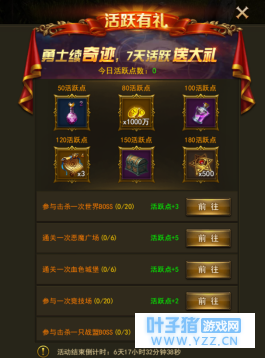 2、 活跃有礼 区服范围: 流失时原区服 玩家回归后在前七天内,每天完成指定的任务可获得活跃点,达到一定的活跃点可以领取指定的奖励。(奖励根据回归时间以及世界等级不同而有所不同)