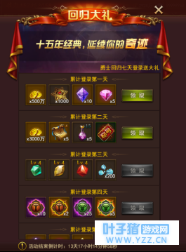1、 回归大礼 :十五年经典,延续你的奇迹 区服范围: 流失时原区服 在回归活动持续时间内,每天登录即可领取对应累计天数的奖励,最高能领取累计7天的登录奖励。(奖励根据回归时间以及世界等级不同而有所不同)