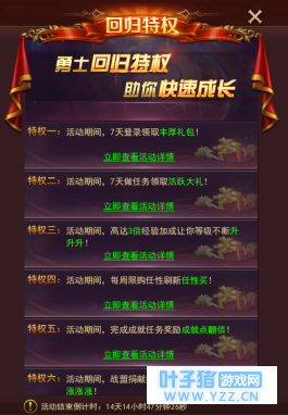一、回归 原区服 若回归的勇士选择留在流失时原区服与老朋友共闯奇迹大陆,可触发回归大礼、活跃有礼、回归特权系列活动。 开启条件:玩家 等级到达250级且连续14日未登陆游戏 即可触发老服回归活动。 活动时间:3月31日5:00 后 活动说明:活动开启后,等级到达250并且连续14日未登录游戏方可触发活动,且活动刷新时间为 每日凌晨5点 。例:玩家在3月31日5点后回归,若要参与回归大礼、活跃有礼、回归特权,必须在3月17日 5点后 未登录过游戏方可触发活动。 (注:天数按活动刷新时间5点计算,即每日凌晨5点到次日凌晨5点算1天)