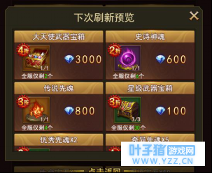 2.玩家可通过活动主界面上的刷新倒计时来得知下一批商品的刷新时间、也可以通过点击【刷新预览】按钮来查看下一次刷新将会刷出的商品详情。 (限购内容根据活动开始时服务器的世界等级获取)