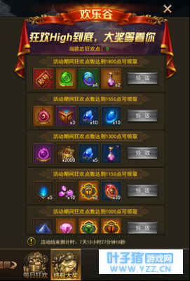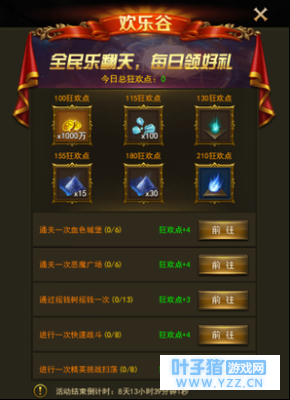 开启等级 : 130级 活动一、每日狂欢乐不停 活动内容: 活动期间,每天完成指定任务可以获得一定的狂欢点数,狂欢点数到达指定值可以获得奖励。每日5点重置事件和狂欢点数。 奖励内容: 100狂欢点:1千万金币 115狂欢点:宝石碎片*100 130狂欢点:普通先魂*1 155狂欢点:魂尘*15 180狂欢点:魂尘*30 210狂欢点: 卓越先魂*1