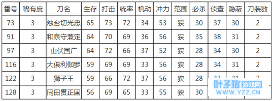 2.因部分活动难度中,存在夜战、市街战和室内战。 在市街战模式下,马匹的属性加成无效。在屋内战模式下,马匹的属性加成无效、 铳兵以外的远战刀装进行的远战不会出现, 并且【大太刀】、【薙刀】的攻击将变成单体攻击。在夜战模式下, 由于时间的影响,在该模式下,【短刀】和【胁差】的能力将得到提升。 因此审神者的出阵部队中应根据实际战斗模式,合理地编成部队并且及时更换部队;