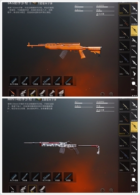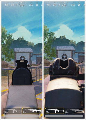 其他方面,Mini14的后坐力低、子弹下坠小却也是它作为射手步枪比较独特的优势。虽然支持的配件数量相比SKS惨淡了不少而且没有握把配件,但前期较低的后座力与较大的弹容量是它独一无二的优势。 反观SKS,它几乎支持了所有配件种类,尤其是枪口配件与握把配件的兼容性非常之高,常见的“垂直握把”与“枪口补偿器”都可以使用。但是缺点也显而易见,没有配件加持下的SKS,机瞄开枪后坐力极高且画面异常抖动,对于萌新玩家十分不友好。 两把枪都有各自支持的皮肤涂装,SKS是“赤橙”,Mini14是“狂怒”。好看与否全看玩家喜好了。 弹药方面,Mini14默认是20发,加装扩容弹夹后可提升至30发。SKS是10发,加装扩容弹夹后可提升至20发。 【机瞄视野对比评测】