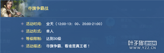【报名入口】 点击主界面右上角“活动”图标进入选择界面; 选择“夺旗争霸战”图标,点击“参加”进行报名。