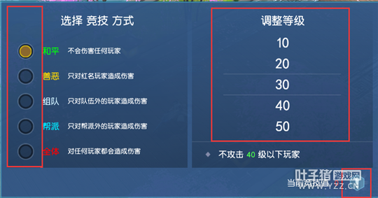 和平 :不会伤害任何玩家。可伤害浅红玩家。 善恶 :只对红名玩家造成伤害。可伤害浅红玩家。 组队 :只对队伍外的玩家造成伤害。即使队伍内有浅红玩家,也不会伤害到。 帮派 :只对帮派外的玩家造成伤害。即使帮派内有浅红玩家,也不会伤害到。 全体 :对任何玩家都会造成伤害。 等级保护 :按照所设定的等级值,不会对低于该等级值的玩家造成伤害。控制技能效果不受影响。例如玩家开启全体攻击,等级限制40级,则所有攻击,都不会对40级以下玩家造成伤害。 例如等级限制对浅红玩家无效,既是你开启了等级40以下不攻击,此时有个浅红玩家30级,你的攻击仍然能伤害到他。 点击“! ”按钮 :开启竞技说明 编辑:叶子猪小秘书