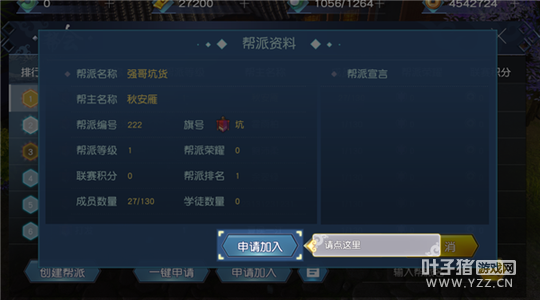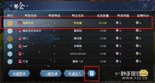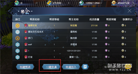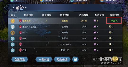 【一键申请】 点击一键申请,可最多发出5个申请,直接向“人员未满,排名最前5个帮派”,发送入帮申请,点击后,再次发送,需等待15分钟。如果已经发出的申请中,部分被拒绝了,例如还有3个未拒绝,则点击一键申请时,只会发出3个申请。
