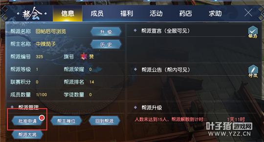 创建方式: 点击创建后开启该界面。 输入 :帮派名,最多7个汉字 输入 :旗号,最多1个汉字,只能是中文。 费用 :创建帮派需要金钱数1500000。 等级 :隐藏条件,需要主角>=10级。 确定 :点击确定后,需要判定是否有重名的帮派,若无,即可创建帮派。扣除费用。 初始帮派等级 :才创建的帮派等级为1级。 批准申请: 已经加入帮派的玩家,首页”信息“会显示如下图效果。