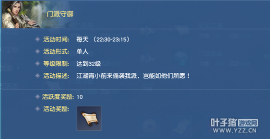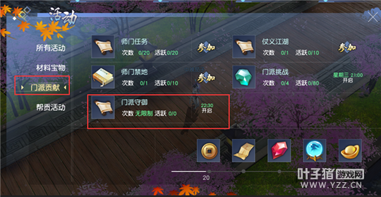 点击主界面右上角“活动”图标进入选择界面; 选择“门派贡献”列表,点击“门派守御”进行参加。
