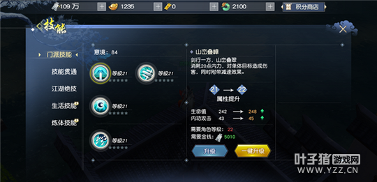 灵虚剑门这个职业门派技能一共有四个: 山峦叠嶂:剑行一方,山峦叠翠。对单体目标造成伤害,同时附带减速效果。 孤战四方:孤战遨游,纵横九霄。对前方范围内标造成多次伤害。 凌波惊鸿:凌波千万里,惊鸿日月新。对周围目标造成大量伤害。 无上灵虚:寒光随风去,青虹照碧空。对周围一定范围内的目标造成多次伤害,同时提升队友攻击力,持续一段时间。