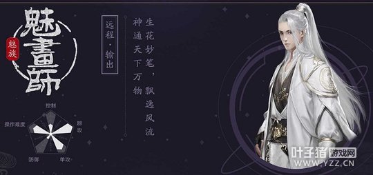 魅画师 魅画师的原型则是半人半魅的人族皇子牧云笙,参透世界万物的运行规律,可以听到人心里真正的声音。在游戏中,魅画师是属于魅族的职业,双重天赋是输出和辅助,可独立输出也可辅助队友,整 体伤害十分爆炸,是伤害最高的职业之一。
