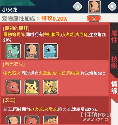 拿小火龙为例:[最初的羁绊]、[电光石火]、[龙王]三条情缘项 [最初的羁绊]: 同时拥有妙蛙种子、小火龙、杰尼龟生命增加20%。 [电光石火]: 同时拥有火恐龙、皮卡丘、闪电鸟特攻增加20%。 [龙王]: 同时拥有小火龙、火恐龙、喷火龙速度增加20%。
