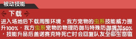 当品质度达到紫解锁-下载(被动技能): 进入场地后下载周围环境,我方宠物的虫系技能威力提升100%,我方虫系宠物的物理防御与特殊防御增加50%,技能升品后盖诺赛克特死亡时会回复队友全部生命值。
