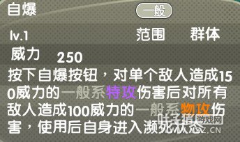 当品质度达到蓝+1解锁-自爆: 按下自爆按钮,对单个敌人造成150威力的一般系特攻伤害后对所有敌人造成100威力的一般系物攻伤害,使用后自身进入濒死状态。威力:250 范围:群体