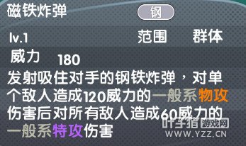 当品质度达到绿解锁-磁铁炸弹: 发射吸住对手的钢铁炸弹,对单个敌人造成120威力的一般系物攻伤害后对所有敌人造成60威力的一般系特攻伤害。威力:180 范围:群体