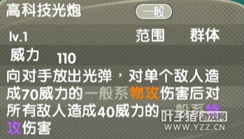 接下来,让我们看看它的技能吧! 初始技能-高科技光炮: 向对手放出光弹,对单个敌人造成70威力的一般系物攻伤害后对所有敌人造成40威力的一般系特攻伤害。威力:110 范围:群体