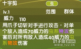 当品质度达到蓝解锁-十字剪: 用爪子切斩对手进行攻击,对单个敌人造成70威力的虫系特攻伤害后对所有敌人造成40威力的虫系物攻伤害。威力:110 范围:群体