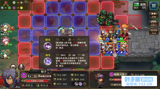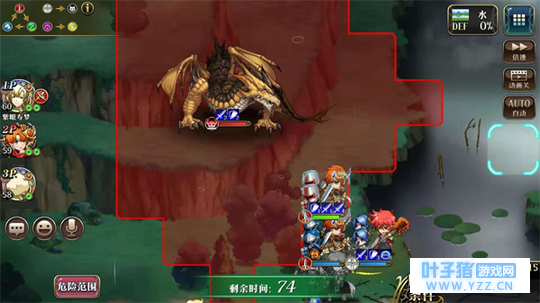 开局配置,艾尔文和雷丁前锋。 □具体打法: 回合1,艾先前进到红区1格,引水怪。若辅助输出是马修或其他有超绝的英雄,则雷丁开神卫,否则超绝。奶骑最后行动,给艾尔文进击,同时走位保证给全员加上治愈之光的buff(行动后回血) 回合2,干掉水怪,艾尔文可使用大喝,但不要剑魂,要留着招呼boss的。 接下来优先干掉黑暗精灵弓兵,因为他的技能比较恶心,会禁止buff施加。不过没能先做掉问题也不大,反正到清完兵这个恶心效果也差不多消失了。 如果不幸中招,奶优先给艾尔文加血驱散负面buff。 清完兵大概第6回合了。 艾尔文进圈1格(带鞋的话)或2格,保证下回合能摸到龙。