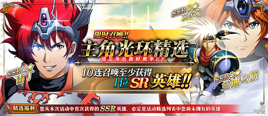 【新限时召唤-主角光环精选】 历代的主角齐聚一堂,手持圣剑,英雄的辉光照耀四方!新召唤卡池登场,SSR英雄雷丁、艾尔文、兰迪乌斯出现概率提升!作为《梦幻模拟战》系列中每一代最为闪耀的英雄,“主角光环”加持可非浪得虚名!无论是反击无双的雷丁还是问鼎巅峰竞技场的兰迪乌斯,亦或者“屠龙小能手”艾尔文,他们都活跃于各个阵容之中且发挥着重要作用。本次召唤还带有精选福利,从本次活动中首次抽取到的SSR英雄,必定是活动精选列表中你尚未拥有的SSR英雄,机不可失哟~