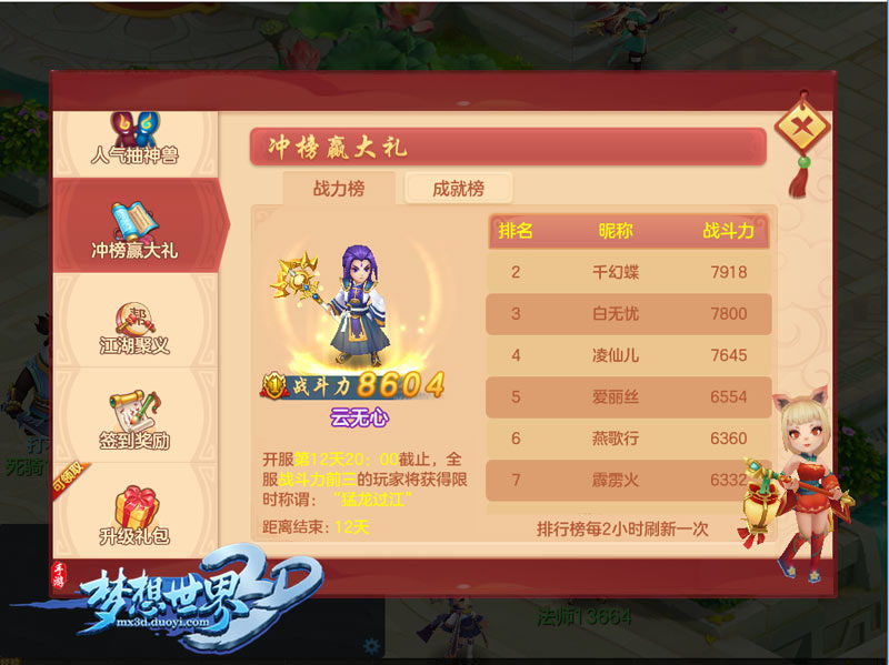 《梦想世界3D》百级全新内容“百炼成钢”现已上线。百级时代,等级突破新纪元,全新坐骑仙气、霸气齐聚,凌霄城之危70级副本开启斗龙新征程,更有全新星龙武器外观现身。《梦想世界3D》新服“气吞山河”12月27日正式开启,新服活动升级!跨年全新内容即将开启,主题新宠降临,新外观、新玩法同步上线。齐相聚,话团圆,梦想团圆饭即将开启。 开服时间: 12月27日12:00气吞山河 壹·首充送神宠 首次充值任意数量的金币,即可获得S级强力萌宠星辰喵,掌握冰晶之力的猫妖长相乖巧可爱却也拥有着猫妖一族保命御敌的法术,新手之路有她相伴少侠必定一帆风顺。更多首充大礼随新宠一同更新,新服等你来! 贰·登录抽神兽 活动介绍: 新服开启后,30级以上玩家可选择支持神兽吉祥鸡阵营或神兽小飞猪阵营。开服第6天晚上,系统会从支持人数多的一个阵营中,抽取一名在线玩家奖励一个神孕之卵。神孕之卵不可出售,指定为所玩家所支持的神兽。 活动对象: 新服等级满30级以上玩家 活动时间: 新服开启后第6天晚19:30进行抽取幸运玩家,可获得神兽一只 叁·登陆抽兽诀 活动介绍: 新服开启后第二天,将从活跃度达到50的在线玩家中抽取一名幸运玩家,获得“高级必杀”兽诀奖励。 活动对象: 新服活跃度达到50的在线玩家 活动时间: 开服第二天19:30 肆·冲榜赢好礼 活动介绍: 开服当天为第1天,新服开启后第12天20:00,人物排行榜排名前三、成就排行榜前三的玩家可分别获得称谓“猛龙过江”和“震古烁今”(限时30天),如综合实力、成就一致,则以达到当前实力的先后顺序来排行。 活动对象: 新服等级满30级以上玩家 活动时间: 新服开启至第12天 伍·天机计划 活动介绍: 开服后玩家参与天机计划活动,通过日常活动获取道具抢夺“预言者”身份,或者选择竞猜每日最佳方位,猜对有更高概率获得更好奖励。 活动对象: 全服玩家 活动时间: 新服开启至第7天 陆·江湖聚义 活动介绍: 江湖因为有情才更精彩,有义才更暖人心。新服开启后,玩家创建或加入帮派,并达成一定条件即可领取礼包。礼包分为3种类型,每个礼包只能领取1次。 活动对象: 新服等级满20级以上玩家 活动时间: 新服开启至第14天 柒·狂欢礼盒 活动介绍: 新服玩家角色等级到达10级之后,会受到来自系统的狂欢礼盒赠送邮件,内含七彩烟花*1、一袋银两*5、幸运兽角*1。 活动对象: 新服等级达到10级的玩家 捌·冲级红包 活动介绍: 新服开启后,玩家达到指定等级和活跃度要求后,即可开启手气红包,随机获得银两奖励,最高可获得888万银两。等级达到40级且累计活跃度满足200时,可领取第1个红包,限量3000份。等级达到50级且累计活跃度达到600时,可领取第2个红包,限量1500份。 活动对象: 新服等级满20级以上玩家 活动时间: 新服开启至红包领完截止 玖·升级礼包 快乐冒险 提升等级,好礼相伴!在游戏中,从10级开始,玩家每提升一定等级,都将获得奖励丰厚的升级礼包。升级礼包除了内含装备包、银两、还童丹、修炼丹、宝石、包袱等日常道具助力升级之外,还有强力宠物、超级宝图、强力兽诀等珍稀道具陪你闯荡梦想大陆! 关于《梦想世界3D》 《梦想世界3D》已全平台上线!招式靠领悟,回合真策略,见招拆招更鲜活!243种招式相生相克展现极限回合策略。释放想象,海量玩法极具创意,迷宫温泉家园系统惊喜等你来探。碎片收集萌宠进化,宠物养成独具特色。萌娃天降,浪漫社交温情相伴,同城好友推荐,享受真实梦想人生。更有炫酷时装翅膀、搞怪头饰、清凉泳装,独特外观百变搭配任你选! 编辑:叶子猪小秘书