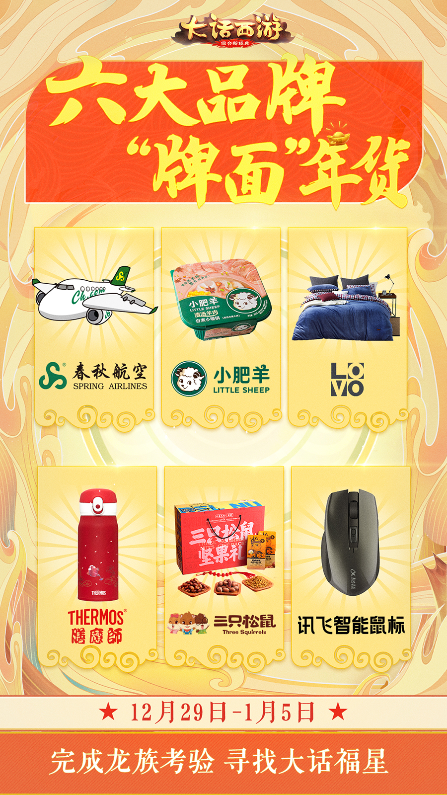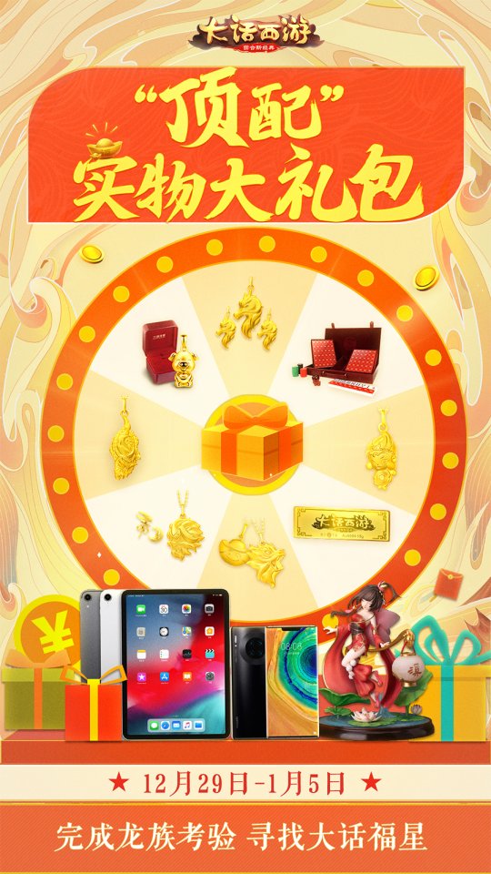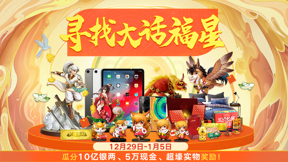 大话福星,豪礼驾到!2020年即将到来,为了感谢三界侠士们在过去的一年里对游戏的热爱和支持,《大话西游》手游准备了一大波的暖春福利活动回馈给玩家们!在活动期间,玩家将有机会成为大话福星,获得鸡驴大神送出的巨额悬赏,享受万千宠爱集一身的超豪华大礼! 完成龙族考验 寻找“大话福星”! 2019年12月29日-2020年1月5日“大话福星”活动火热来袭!在新的一年即将到来之际,鸡驴大神决定悬赏巨额实物奖励寻找集万千宠爱于一身的“大话福星”,将好运和财富分享给更多的大话兄弟! 2019年12月29日-2020年1月3日期间,玩家每日10:00在“活动”界面参与相关任务,接受1位龙族角色的挑战,完成分享求赞、每日助力、好心值获取、绑定回流玩家等任务,就能获得积分。玩家在活动期间每日21:30前获得1500积分,就可以领取奖励并参与抽取当日22:00的龙族福星大奖,全服每日仅有1名! 另外,在6天的活动时间内有,玩家只要有4天完成挑战任务则可参与最终抽奖,6天任务全部完成还能够获得纪念称谓! 在2020年1月3日-1月5日中午12:00,符合最终抽奖条件的玩家就可以填写抽奖卡组,在1月5日晚的大话暖春同乐会活动现场参与福星卡组的抽取!届时将通过抽奖送出“大话福星奖”超级大礼包,奖品包括2019年12月29日-2020年1月3日所有的龙族福星大奖,奖品除了各种大话珍稀手办,还有黄金金条、iPad Pro、华为手机等,豪华程度旷古绝今,震撼好运横扫三界! >>>>大话福星奖品列表如下: 12月29日忘忧子福星大奖:夜溪灵手办、飞剑侠手办、狐小妖手办 12月30日骊珠儿福星大奖:年手办、年黄金足金吊坠 12月31日龙渊客福星大奖:黄金兽黄金足金吊坠、麒麟黄金足金吊坠、猴小兵黄金足金吊坠 1月1日木兰行福星大奖:大话 999K纯金金条、大话x六福 金猪吊坠、春秋航空免费机票、膳魔师锦鲤保温杯、三只松鼠坚果大礼包、LOVO四件套、科大讯飞智能鼠标、小肥羊自煮小暖锅 1月2日沧浪君福星大奖:iPad Pro 1月3日莫解语福星大奖:华为 Mate 30 pro 5G 鸡驴大神送好礼 瓜分银两和现金! 1月5日晚,大话暖春同乐会活动现场除了将抽取福星卡组之外,猜对福星卡组中单个号码位置的玩家还可以获得对应奖励,猜中越多奖励越大!10亿银两奖金、5万元现金、限时时装、珍稀游戏道具统统奉上! >>>>奖品列表如下: 万中无一奖:若玩家所填卡组在全服无人相同,则平分10亿银两!若仅有1人所填卡组为全服唯一,鸡驴大神认为你天生奇才,万中无一,决定让此人独享10亿银两! 人多势众奖:所填的卡组在全服中重复的数量最多!众志成城,鸡驴大神被你们的团结所感动,决定让该卡组所有玩家共同瓜分10亿银两! 四喜临门奖:猜中四张福星卡牌。获奖玩家共同瓜分5万元现金。 三阳开泰奖:猜中三张福星卡牌。必然得到限时时装,还有几率得到高价值游戏内道具。 两全其美奖:猜中三张福星卡牌。必然得到限时时装,还有几率得到高价值游戏内道具。 (注意:大话福星奖、四喜临门奖、三阳开泰奖、两全其美奖四个奖项最多只能获得一个;举例,大侠猜对了四张卡牌,获得四喜临门奖,但是不会额外获得三阳开泰奖、两全其美奖。) 兄弟围炉西子湖 免费来吃小肥羊! 除了为大话兄弟们准备了福星奖励,我们还携手小肥羊打造了大话主题火锅店;邀请大话兄弟一起来吃免费火锅!就在2020年1月4日,小肥羊(湖滨银泰in77B区店)!更有大话coser现身互动、惊喜年货掉落!好看好吃还好玩,江浙沪的兄弟在等什么?赶紧填写问卷(https://game.163.com/s/?id=393)报名吧! 来不了杭州的兄弟也没关系,我们约上大话兄弟一起在线“云火锅”!2020年1月5日晚,锁定CC官方直播观看“暖春同乐会”,三界兄弟共聚火锅年夜饭!通过12月31日上线的“大话福乐会”小程序预约观看同乐会,还能抽取壕礼——15g 999K纯金金条、价值3968元的网易味央黑猪肉年卡和大话西游2020少年贺新禧礼盒等豪华年货大礼等你来拿!同乐会当晚除了大家熟悉的coser之外、还将有神秘明星惊喜现身!更有六大品牌助力,为三界兄弟送上牌面年货! 此外,大话手游一系列暖春活动也将陆续登场,玩家参与活动不仅能享受到免费专机、1元机票、免费大餐等多重福利,还能获得暖春回家基金、兄弟团聚基金等大话手游准备的超值福利!暖春惊喜不间断,海量好礼送不停,更多游戏、赛事信息,请关注《大话西游》手游官网、官方论坛、官方大神。 编辑:叶子猪小秘书