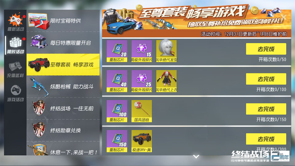 热血迎战2020,新年尽享开黑乐趣!网易快节奏开黑枪战竞技手游《终结战场》12月31日再度更新,全新套装“风华绝代”惊艳上线引领国风时尚浪潮,备受好评的全新战队玩法打造外观共享全新体验,更多惊喜福利即将开启,陪你跨年! 战队共享 轻松玩转时尚团建 在上周更新中,战队系统的出现为玩家提供了更多竞技交流的渠道与新鲜体验,创建、加盟战队后玩家不仅可以充分感受并发挥“集体”的力量,还可以享用专属聊天频道,齐心协力建设战队,体会集体荣誉的魅力。 更加有趣的是,战队的“外观共享”功能(测试版)还能让同队玩家实现外观分享互借,战队成员将自己拥有的外装、枪械、载具、滑翔翼等橙色外观放入共享池后,其他成员可以从共享池中借取该外观使用,一人酷炫全队时尚,让团队面貌来得更耀眼一些!外观借用时间限定为1天,超出时限后外观将自动归还至出借者仓库。 风华绝代 至尊上新惊喜不断 在本周至尊补给中,国风外观“风华绝代”正式登场!经典红白黑三色搭配尽显端庄大方,别致的剪裁设计、金线纹饰以及传统饰品的点缀,让这套战场时装飒爽中别有高贵、利落,又不失典雅。 抽取本周至尊补给,玩家不仅有机会直接获得这套绝色外观,还可能得到皮卡车外观“极速ORV-黄”和苍蝇拍外观“国风团扇”。 以上奖励也可以通过至尊套装兑换活动获得,更多实用道具珍贵材料一并送上,为开黑之旅增添助力。 冰雪节即将告别 累计充值福利开启 陪伴玩家度过圣诞假期的冰雪欢乐节进入尾声,圣诞签到赢好礼活动将在1月1日上午7点正式结束,还未领取奖励的玩家请抓紧时间。1月1日至1月3日,“排位分多多”活动开启,在此期间玩家组队排位不仅不会掉分,还可以享受排位分提高20%的收益加成。同时游戏大厅更新在线礼盒,至尊补给券、重制芯片等奖励免费领取。 本周更新后至1月8日更新前,“累计充值赢好礼活动”开启福利大放送,玩家充值即有机会获得海量金币、彩钻、道具奖励,更有超炫枪械皮肤“耀豹”、积分宝箱兑换等你来拿。 新年将至,《终结战场》惊喜欢乐延续,本周限免英雄阵容为终结猎手、赏金猎手、合成异兽、永生伯爵,与战队系统、英雄等级系统共同组建全新战场体验!即刻登录游戏官网加盟《终结战场》,更多新年福利即将解锁,快节奏开黑畅爽整个假期! 关于《终结战场》 英雄归来,终结战场!2周年全新英雄模式刺激开战!彗星巨炮、特工潜行,召唤空投,任选秘宝,专属技能,无限复活!爽快开黑,颠覆想象!给你超酷超燃的对决体验!S11赛季火爆进行中,新英雄幻星之梦、幻想之子梦幻登陆,给你极致畅爽体验! 编辑:叶子猪小秘书