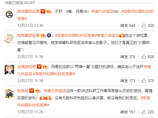 12月27日,网易游戏2019年收官之作《第九所》在App Store燃泪首发。首发当日与共青团中央一起发起#致敬共和国科研拓荒者#的话题,吸引了众多玩家的参与和好评。 玩家纷纷高呼“被戳到”!成为致敬自来水 一起#致敬共和国科研拓荒者#话题发出不到一天的时间,阅读量便已经超过1500万。大量KOL、玩家成了自来水,纷纷参与转发。 不少玩家从游戏中联想到了自家长辈的经历,纷纷表示“被戳到了”、“感慨”,也有玩家面对游戏中的科研难题时直呼:“确实是感受到了艰苦!” 更有许多玩家化身“正能量段子手”,在致敬科研先驱们的同时,还不忘“天秀”一番,被网友争相转发送上热门。 没有生搬硬套的说教,真实和感动,是《第九所》留给玩家们的第一印象。 中国青少年新媒体协会权威指导 亲历最真实的感动 《第九所》是由网易游戏自研、以中国青少年新媒体协会作为指导单位的精品手游,在游戏中,玩家将会以一个普通科研工作者的身份,亲身经历一段科研奋斗史。 你将前往戈壁深处,建造科研基地,自给自足抵抗风沙严寒,最终成功研发“两弹一星”,后续还有探月工程等一系列彩蛋等待玩家发掘。 题材玩法独特、被团中央“翻牌”的《第九所》,在玩家口碑方面表现也相当不俗。而玩家的反馈,向来是游戏质量的晴雨表,《第九所》的游戏品质毋庸置疑。 还没有尝鲜的小伙伴,不妨到官网(https://djs.163.com/)、App Store、各大渠道应用商店下载、预约游戏,乘上开往戈壁滩的绿皮卡车,以用自己的方式,亲眼见证中国科研事业的发展腾飞吧! ※关于《第九所》 《第九所》以我国从“两弹一星”到“载人航天”的重大科技项目奋斗历史为背景,以城建式沙盒建造为游戏模式,讲述爱国奉献、艰苦奋斗的感人故事,让我国科技先驱们“热爱祖国、无私奉献,自力更生、艰苦奋斗,大力协同、勇于登攀”的精神再次得以展现。谨以本作品致敬所有「共和国科技拓荒者」。 编辑:叶子猪小秘书