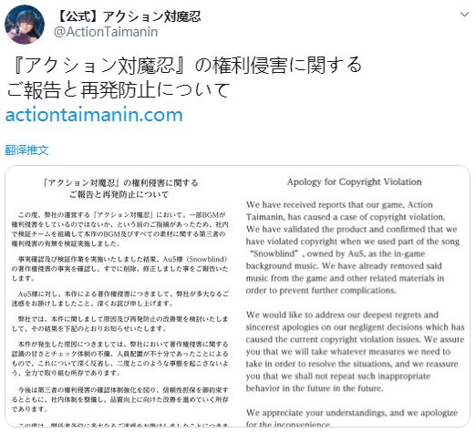 日前于日本正式推出的 ARPG 手游《Action对魔忍(アクション対魔忍)》(iOS / Android),被玩家发现游戏内战斗时的 BGM 疑似抄袭美国音乐制作人「Au5」的作品,在移除相关 BGM 后,也正式发布了道歉声明。 官方推特: 日本作曲家 Laur 日前发现游戏内 BGM 似乎与 Au5 的作品「Snowblind」当中一部分雷同。Laur 于 Twitter 上提到,游戏 BGM 盗用了「Snowblind」一段重低音的部分,并剪去歌手声音不断循环播放,而官方网站及游戏内均没有出现 Au5 的版权标记。 官方在道歉声明中表示,为确认抄袭是否属实,公司内部成立了检验小组,查明游戏内 BGM 及相关素材是否有侵犯到第三者的权益。检查结果指出,抄袭一事属实,目前已移除该 BGM 并做修正,对于侵犯到 Au5 的权益感到十分抱歉。 关于事件发生的原因,官方指出,由于对著作权侵害相关的法律认知不足,以及对检查体制、人员配置的疏失才导致本次事件发生,目前已深刻反省,将强化对第三者权力侵害的检察体制,尽力避免同样的事件再度发生。 《Action对魔忍》是改编自知名成人游戏《对魔忍》的手机动作RPG游戏,通过简单操作便能施展出流畅打击动作。游戏中玩家将化身特务中队的指挥官,前往挑战世界各地的任务,率领《对魔忍》系列的角色们讨伐人外魔道。 编辑:叶子猪小秘书