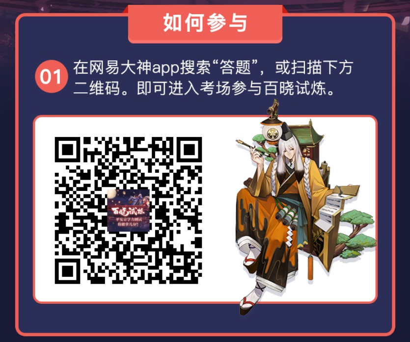 阴阳秘术知缥缈,尤问平安百晓生。新年已至,是时候验收你在《阴阳师》的学业成果了。平安京史上最难高考——“百晓试炼”重磅来袭,数百道专业有趣的问答,等你来挑战!参与答题就100%获奖,答对题目越多,奖品越丰厚;更能投稿题目当一回平安京考官。快来网易大神参加阴阳师“百晓试炼”,看看谁能站到最后,夺得“平安京百晓生”的名号吧! 【闯关上榜拿奖励 争做平安百晓生】 稻荷神御馔津脚下有几只小狐狸?阴阳师正式公测的日期是几月几号?1月2日至1月14日,参加网易大神“百晓试炼”问答挑战,检测自己的《阴阳师》学力。“百晓试炼”采用一站到底闯关模式,答错1次即挑战结束,首次答错可以通过分享界面获得一次继续答题的机会。在网易大神app搜索“答题”,或扫描下方二维码即可参与答题。 活动传送门:https://act.ds.163.com/93dcd3b7a7f888e6/?ds=wx 参与答题就有机会获得现世符咒、皮肤券、吉运达摩、大蛇的逆鳞等丰富游戏奖励!根据成绩排名分别可获得“阴阳师百晓生”、“阴阳师大学士”、“阴阳师学霸”、“阴阳师高手”四款头像框!奖励将会发放至活动结束时玩家所选择的答题角色账号上。欢乐答题,奖励多多,快来网易大神为你精心布置的考场,交出一份满意的“百晓试炼”答卷吧! 同时,题库会进行不定期更新,也欢迎各位玩家投稿题目。投稿一经采用,玩家可以获得一份阴阳师出卷人奖励(每个账号最多获得5次)。 投稿地址:https://survey.163.com/htmls/c4y3eu/paper.html 【关于“网易大神”】 网易大神是网易游戏旗下的精英玩家社区。这里汇聚了广大精英玩家、游戏圈红人、行业大咖,集合了网易独家的官方资讯和福利趣闻,旨在为玩家打造一个丰富的游戏兴趣社交圈。玩家可以在网易大神与游戏中的好友实时聊天、多元互动;以游戏会友,结交更多游戏同好,和大神一起发现更多游戏乐趣。 编辑:叶子猪小秘书