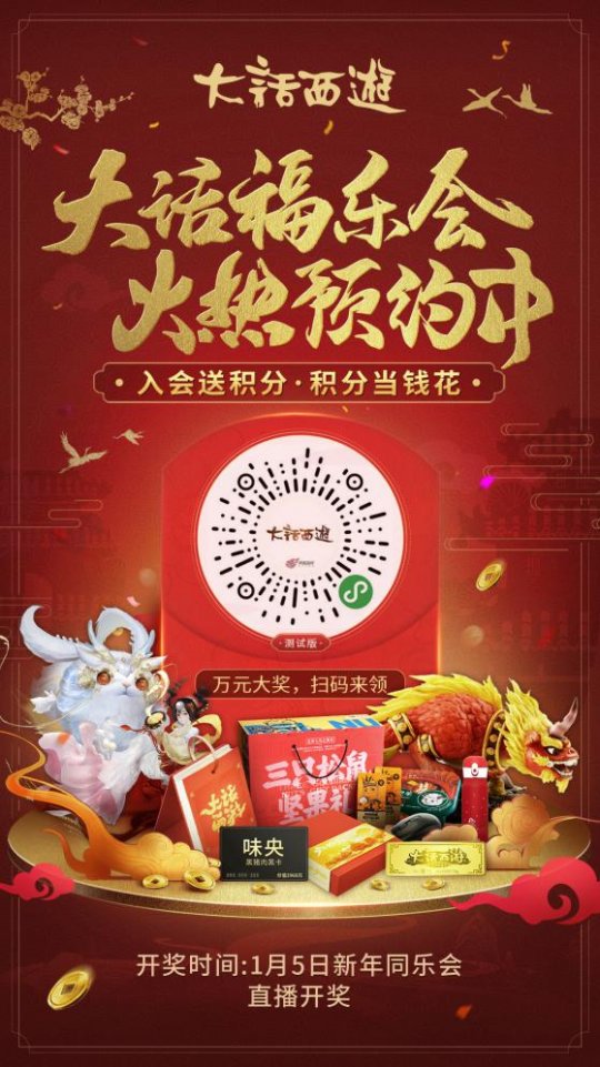 2020年即将来临,为了庆祝新的一年到来,《大话西游》手游暖春同乐会即将在1月5日火热开启,届时5万元现金、20亿银两、福星大奖得主即将在现场重磅揭晓!更有专属大话兄弟的大话福乐会开启预约,豪礼送不停! 周日杭城同乐会 大话兄弟齐贺岁 2020年1月5日晚,大话暖春同乐会将在杭州开启,我们邀请所有大话玩家通过观看直播、参与抽奖的形式,加入这场福利满满的“大话春晚”!除了大奖抽取,同乐会现场还将有神曲《野狼Disco》原唱宝石哥现身,与大话龙族同跳画龙舞!作为十城时光巡礼的最终站,川剧变脸、苏州剑舞、天津相声、街舞功夫等特色节目也将为同乐会献礼,更有大话美女coser齐贺岁!这场大话暖春同乐会将满足你的所有期待! 除了精彩的节目,同乐会最重磅的当然是三界最幸运的“大话福星”抽奖,以及瓜分5万元现金、20亿银两的超壕奖励!记得完成游戏里的任务并准时收看周日晚的同乐会直播,愿鸡驴大神与你同在! 纯金金条!承包整年猪肉!预约奖励壕无人性 为了回馈支持大话多年的玩家朋友们,在暖春同乐会到来之际,我们正式推出大话福乐会——一个专为大话西游玩家搭建的会员回馈平台,在这里,大家投入游戏的金钱和时间,都能转化为积分,带来福利与特权! 初次见面,福乐会为大家准备了壕气满满的见面礼!前2020名参与预约的玩家,每人都将100%获得大话茶馆情义茶礼1份,此外,所有成功预约的玩家均可参与1月5日暖春同乐会现场的抽奖,纯金金条、大话西游2020少年贺新禧礼盒、网易味央黑猪肉年卡、六大品牌年货好礼等你拿!辛劳一年,错过这个活动可就亏大啦! 无兄弟,不大话!抱团预约礼更厚!此次的预约活动中,还将有无数玩家心中的无价之宝——年手办、鎏金宝鉴珍爱版送出! 叫上好友组团进行福乐会预约,我们将从所有组成5人团的玩家中,随机抽取3人送出珍稀的年手办!除此之外,所有组成3人及3人以上团参与预约的玩家中,我们还将从中随机抽取2人,送出2019版鎏金宝鉴珍爱版!悄悄告诉大家,超过三人抱团预约,概率更高哟,赶快一起抱团来领大话送出的壕气大礼吧! 积分免费送 直接当钱花 别着急!参与福乐会预约还有第三重福利!在1月5日福乐会拼团活动结束时,我们将根据团内人数进行梯度奖励结算,送你可以当钱花的海量积分,在大话福乐会小程序的其他玩法正式上线时,会员积分就是真金白银,可以免费兑换各种游戏好礼! 积分奖励规则: 成功预约入驻,奖励160分 2人成团,奖励266分 3人成团,奖励366分 4人成团,奖励466分 5人成团,奖励888分 距离2020暖春同乐会正式开启还有5天,别让福利从你手边溜走,即刻扫码入会,叫上好兄弟一起抱团,为自己拿下新年开门彩吧! (温馨提示:当前为小程序试运营版本,此版本仅开放ios和官网安卓玩家预约,后续正式版将对全平台版本用户开放(包含各大安卓渠道),渠道服玩家将可直接获得366积分测试预约福利以及更丰厚的会员专属奖励,敬请期待。) 为了帮助各位兄弟锁定最重要的开奖时刻,我们还贴心定制了微信预约提醒功能,扫描下方二维码,即可一键预约同乐会提醒!同乐会当天收到提醒后,记得蹲守直播,查看自己是否中奖哦,也许你就是万人艳羡的大话福星! 这个春节,大话暖春福利升级来袭,“大”不一样!还等什么!喊上兄弟,抱团预约大话福乐会吧,纯金金条、年手办等你拿!前2020名预约的兄弟更能100%中奖,把大话茶馆情义茶礼带回家!大话诚意十足,只为给你满满的新年福利! 编辑:叶子猪小秘书